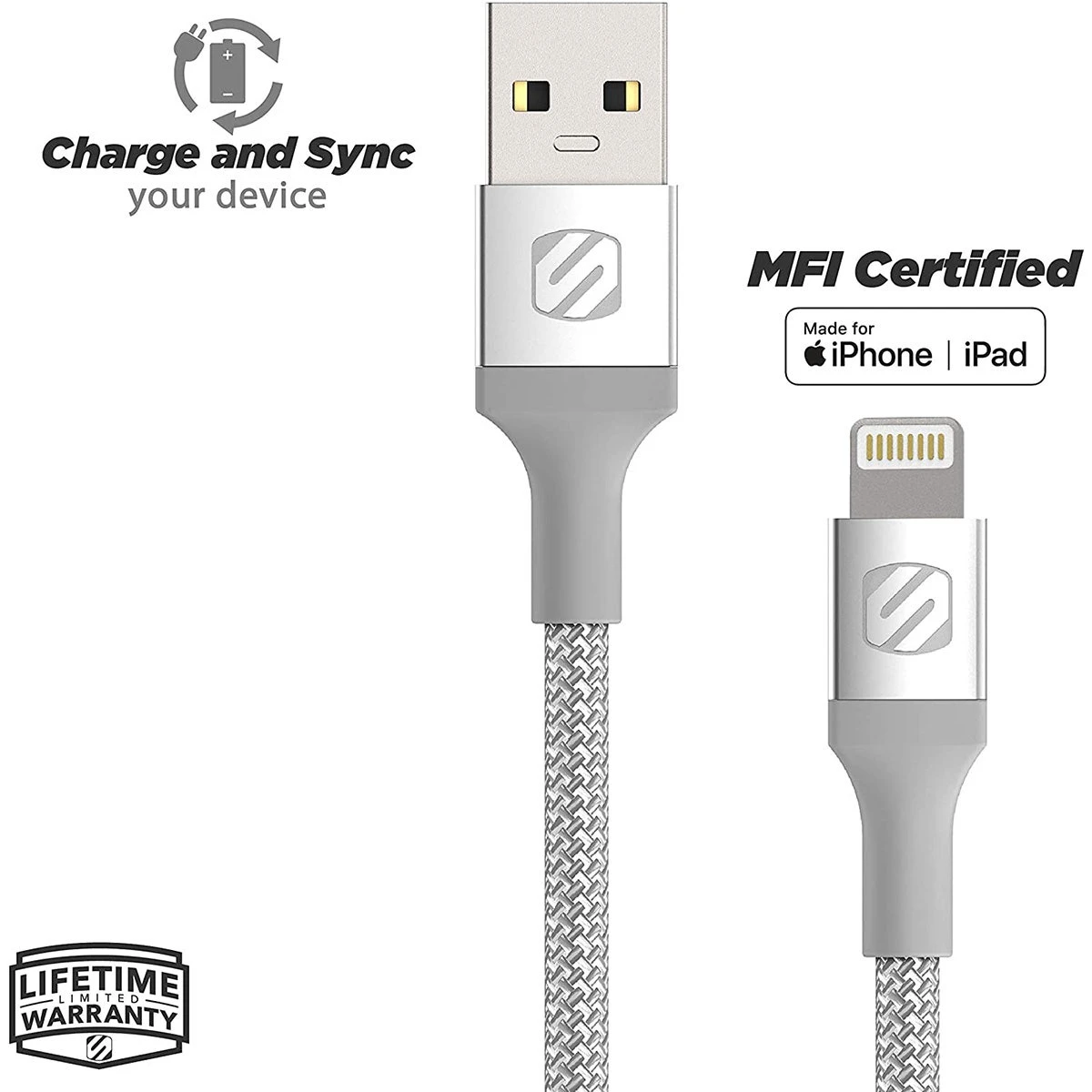 The Scosche I3B4SG Strikeline data and charging cable is perfect for easy charging and syncing of any Apple Lightning device. With MFi certification, you can be assured of its full compatibility with all your Apple Lightning device(s). Using a case” No problem! The compact Lightning cable is equipped with a convenient slim-tip Lightning connector which fits flawlessly with most device cases without removing the case. Connect the cable to your devices Lightning port from any USB port for fast data transfer and charging speeds. The braided design ensures that this cable will stay tangle-free during use. The high-quality cable is backed by Scosche’s 3-year warranty.
